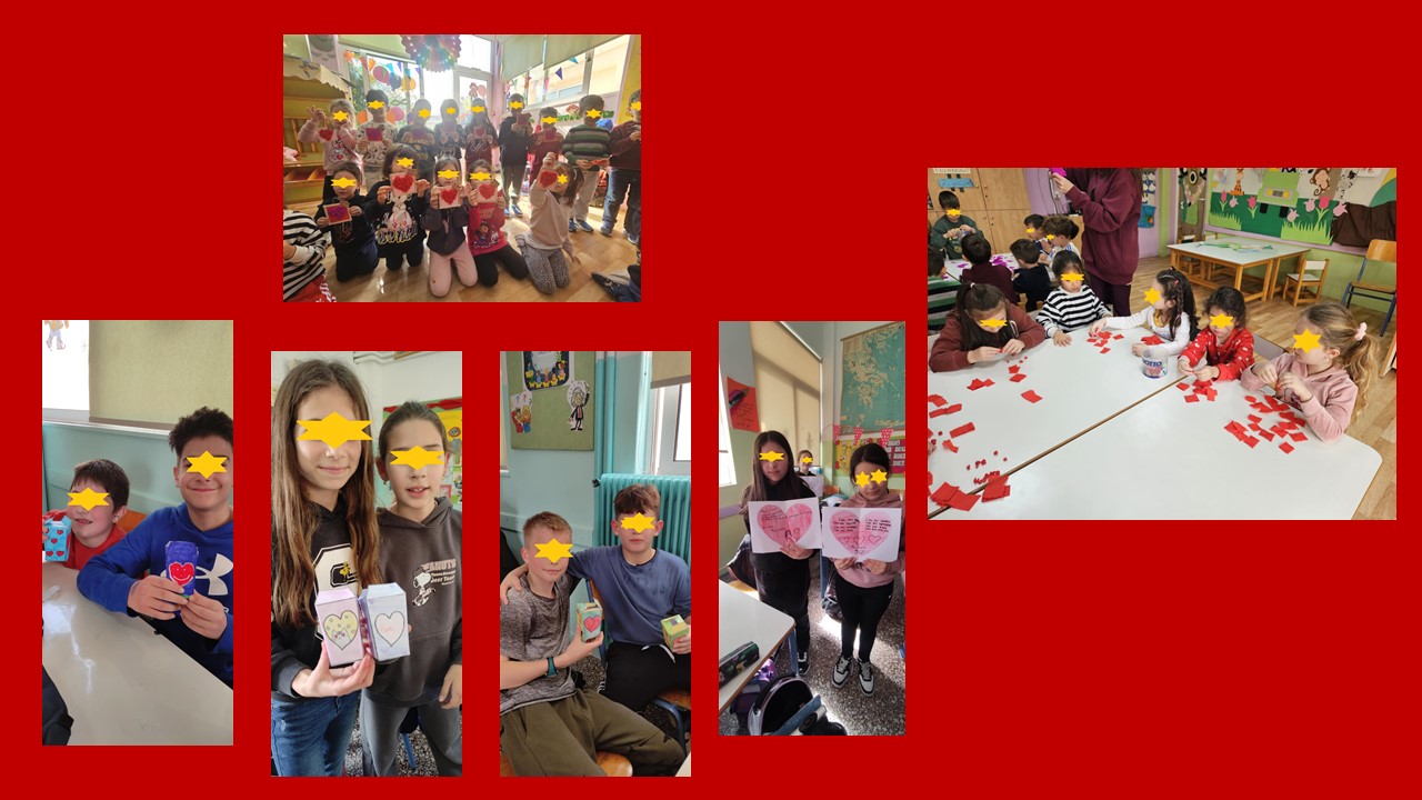 Στο σχολείο μας, πραγματοποιήσαμε διάφορες δράσεις με θέμα την αγάπη, προάγοντας τη συνεργασία και την αλληλεγγύη! Φτιάξαμε καρδιές με μηνύματα αγάπης, τις οποίες χαρίσαμε σε συμμαθητές και δασκάλους, εκφράζοντας έτσι την εκτίμησή μας και μιλήσαμε για τη σημασία της προσφοράς και της καλοσύνης.