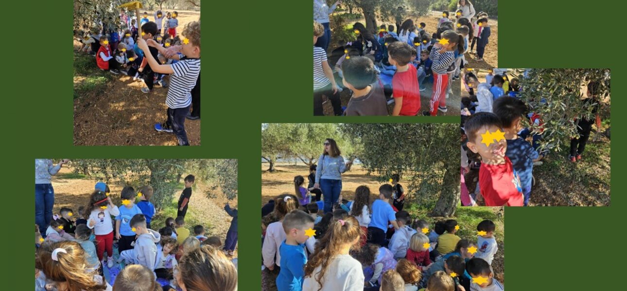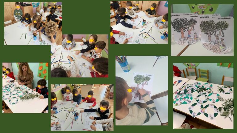 Τα μικρά μας νήπια και προνήπια στα πλαίσια του προγράμματος “Ελιά Ελίτσα” πραγματοποίησαν επίσκεψη σε ελαιώνα όπου παρατήρησαν το δέντρο της ελιάς, μίλησαν για τις ευεργετικές ιδιότητες του καρπού και του λαδιού, δραματοποίησαν τον μύθο της Αθηνάς και του Ποσειδώνα, δημιούργησαν στεφανάκια λογικής σειράς ” από το δέντρο της ελιάς στο λάδι”, ζωγράφισαν το λιομάζωμα και στο μάθημα της γλώσσας με τα μολυβάκια τους έγραψαν προγραφικές εργασίες με θέμα την Ελιά.