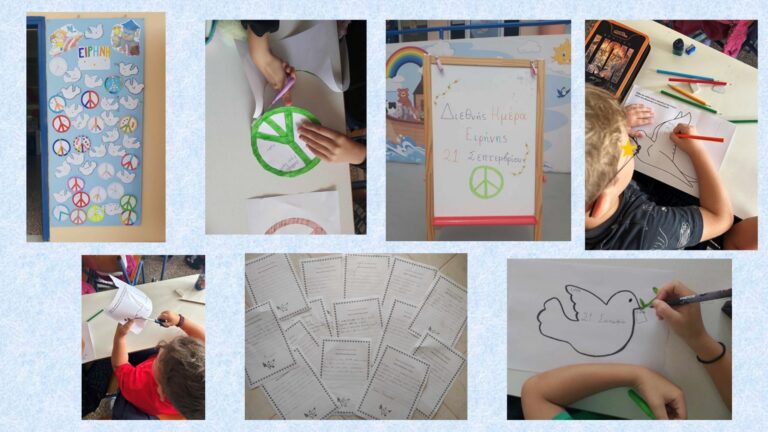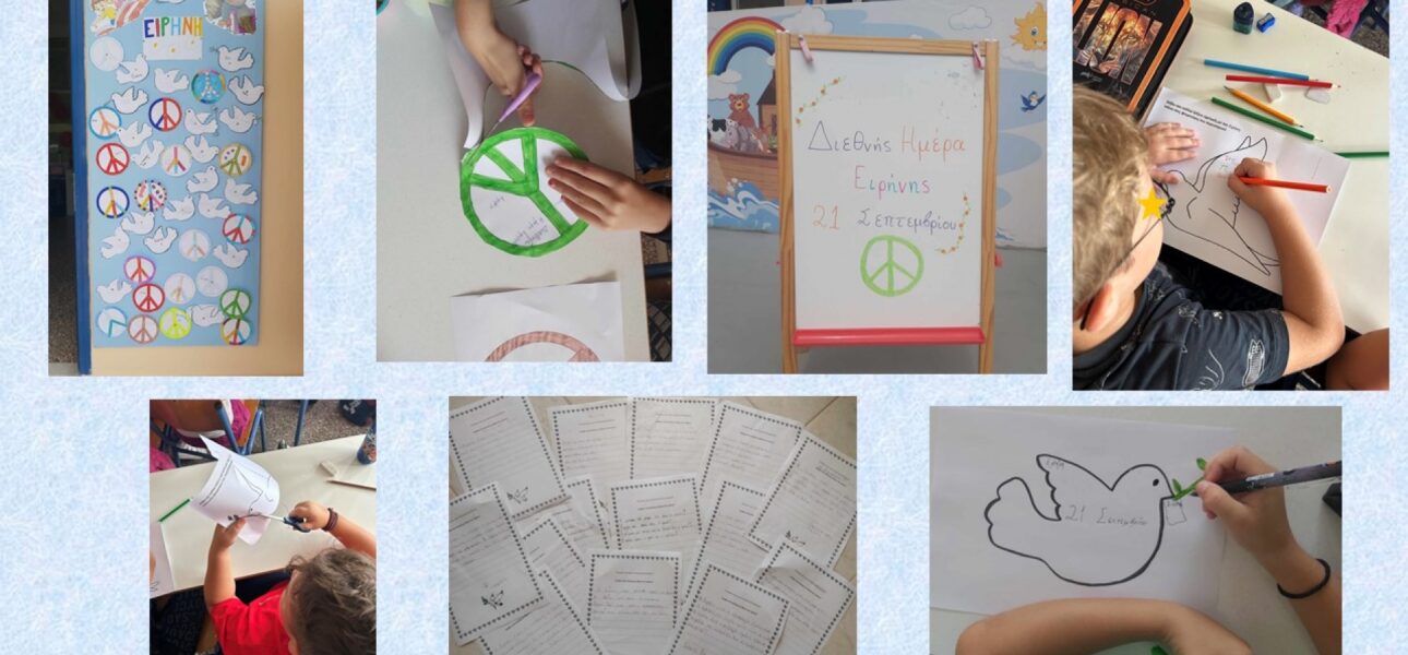 Με αφορμή την Διεθνή ημέρα Ειρήνης, η Γ΄ και Δ΄ τάξη του σχολείου μας, συζήτησε για την έννοια της ειρήνης και στη συνέχεια ζωγράφισε τα σύμβολα της ειρήνης. Επεξεργαστήκαμε ποιήματα του Γιάννη Ρίτσου και του Βασίλη Ρώτα με τίτλο « Ειρήνη». Τέλος οι μαθητές της Δ΄ τάξης έγιναν ποιητές και έγραψαν τα δικά τους ποιήματα.