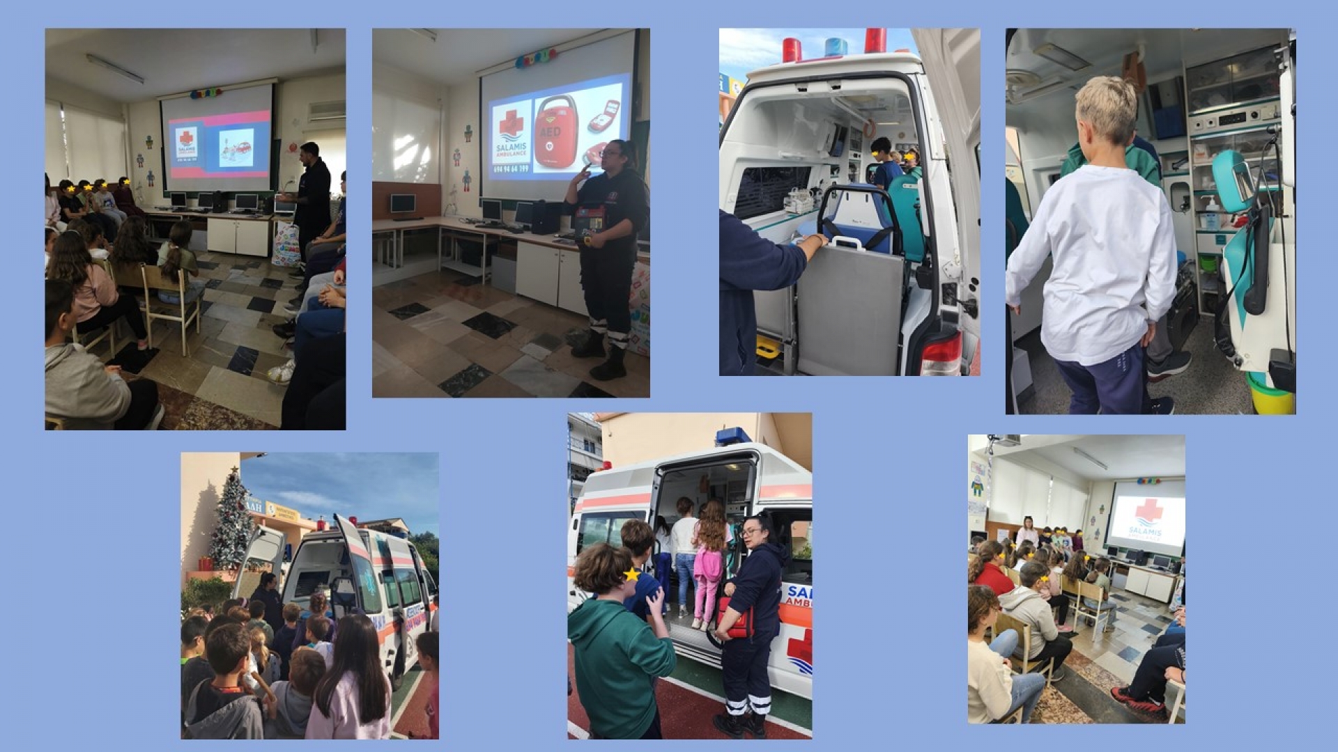 Οι μαθητές του σχολείου μας παρακολούθησαν μια ιδιαίτερα ενδιαφέρουσα και χρήσιμη ενημέρωση σχετικά με τις πρώτες βοήθειες. Κατά τη διάρκεια της δράσης ενημερώθηκαν από ειδικούς διασώστες της Yπηρεσίας Aσθενοφόρων Σαλαμίνας SALAMIS AMBULANCE για τους πιθανούς κινδύνους που μπορεί να προκύψουν στην καθημερινότητα και για το πώς μπορούμε να αντιδράσουμε σωστά και με ψυχραιμία σε περίπτωση ανάγκης. Έμαθαν τη σημασία του ευρωπαϊκού αριθμού έκτακτης ανάγκης 112 και γνώρισαν από κοντά το εσωτερικό ενός ασθενοφόρου διάσωσης, βλέποντας τον εξοπλισμό και τον τρόπο λειτουργίας του. Ήταν μια εμπειρία που ενίσχυσε τις γνώσεις τους και καλλιέργησε την υπευθυνότητα και την ετοιμότητά τους.