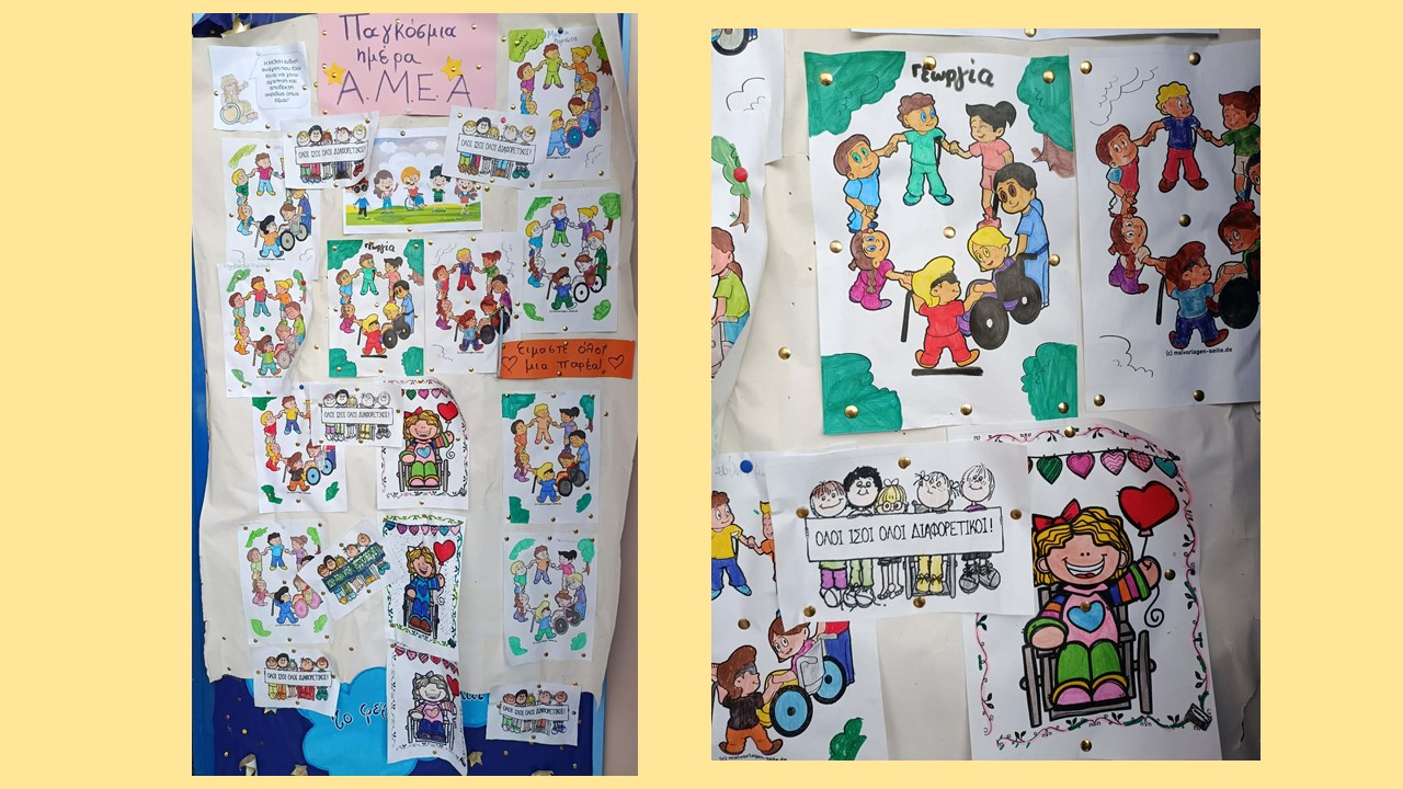 Στο σχολείο μας, με αφορμή την Παγκόσμια Ημέρα Ατόμων με Αναπηρία, αφιερώσαμε χρόνο για να γνωρίσουν οι μαθητές και οι μαθήτριές μας την έννοια της αποδοχής, του σεβασμού και της συμπερίληψης. Μέσα από συζήτηση, προβολές και βιωματικές δραστηριότητες, τα παιδιά ενημερώθηκαν για τις δυσκολίες που μπορεί να αντιμετωπίζουν άτομα με αναπηρίες, αλλά και για τη δύναμη, τις ικανότητες και τα δικαιώματά τους. Στη συνέχεια ζωγράφισαν κάποια υπέροχα έργα που διακοσμούν τον πίνακα του σχολείου.