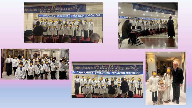 Με μεγάλη χαρά και περηφάνια η Χορωδία του Σχολείου μας συμμετείχε στη 17η Διεθνή Συνάντηση Σχολικών Χορωδιών, στο πλαίσιο του 43ου Διεθνούς Φεστιβάλ Καρδίτσας. Τα παιδιά τραγούδησαν με την καθοδήγηση της καθηγήτριάς τους Θεώνης Μούλτου, ενώ στο πιάνο τα συνόδευσε με ξεχωριστή ευαισθησία η πιανίστρια Νεφέλη Παρασκευά, αναδεικνύοντας μελωδικά κάθε τραγούδι. Ήταν μια μοναδική εμπειρία που μας έδωσε την ευκαιρία να παρουσιάσουμε τη δουλειά μας, να γνωρίσουμε άλλες σχολικές χορωδίες και να ζήσουμε το πνεύμα του φεστιβάλ μέσα από τη μουσική και τη συνεργασία.