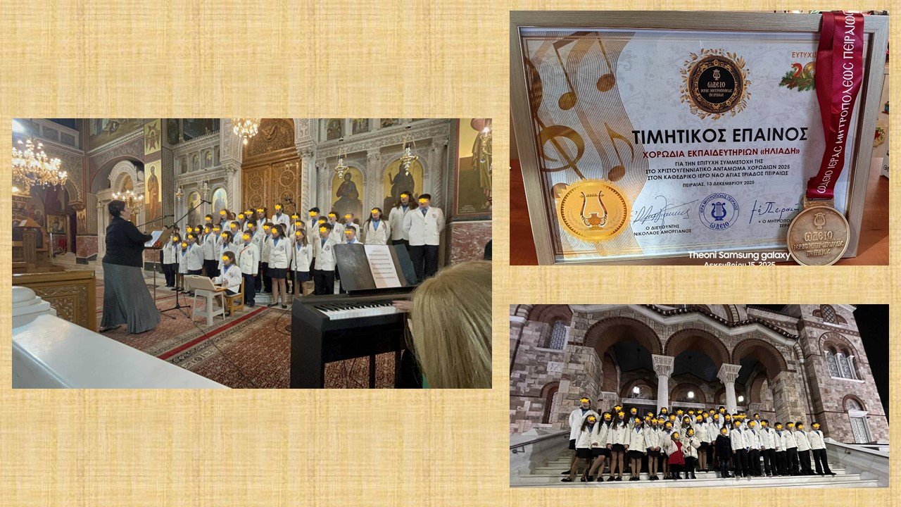 Η χορωδία του σχολείου μας συμμετείχε στη χριστουγεννιάτικη εκδήλωση της Χορωδίας της Ιεράς Μητροπόλεως Πειραιώς, χαρίζοντας στο κοινό μια ιδιαίτερα όμορφη και συγκινητική παρουσία. Οι μαθητές και οι μαθήτριες απέδωσαν με ευαισθησία και αρμονία το μουσικό τους πρόγραμμα, υπό την καθοδήγηση της καθηγήτριάς τους Θεώνης Μούλτου και με τη συνοδεία στο πιάνο της πιανίστα κα Χρύσας Σόφρα, συμβάλλοντας ουσιαστικά στο κατανυκτικό και εορταστικό κλίμα της εκδήλωσης. Ως αναγνώριση της προσπάθειας και της εξαιρετικής παρουσίας της χορωδίας μας, απονεμήθηκε στο σχολείο και τιμητικός έπαινος.